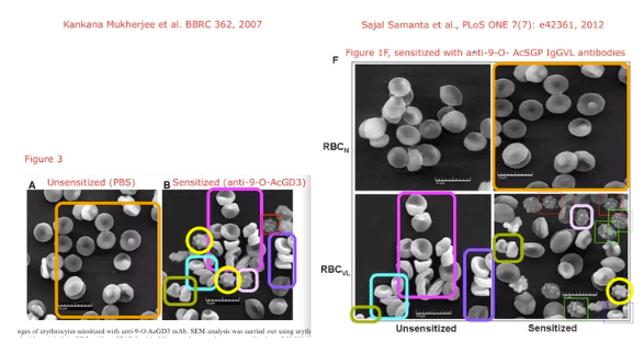 In Fig 1F, a cell with aberrant morphology appears to be duplicated within the RBCVL (sensitized) panel, and a cell cluster in this panel appears similar to a cluster in the RBCVL (unsensitized) panel. The RBCVL (sensitized) and RBCVL (unsensitized) panels appear to include several cells and cell clusters that overlap with Fig 3B of [2]. Also, the RBCN (sensitized) panel appears to overlap with data reported in Fig 3A in [2]. The images including similar elements represent different experiments in [1] and [2].